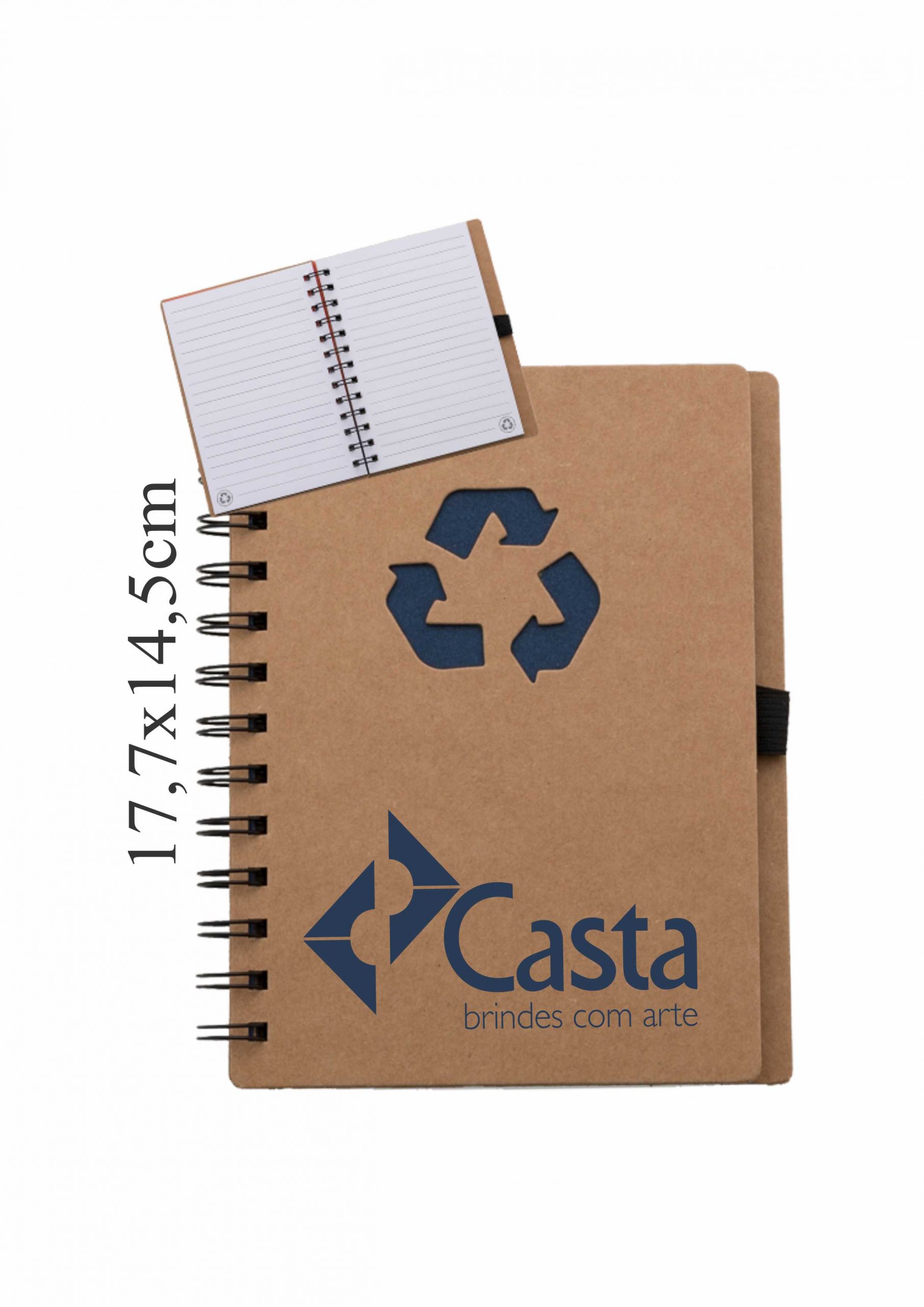 Caderno ecológico com símbolo reciclado na capa, acompanha folhas coloridas estilo folhas de guarda nas cores: vermelho, amarelo, laranja, azul, verde e preto, possibilitando selecionar a cor desejada como fundo do logo reciclado. Possui aproximadamente 70 folhas brancas pautadas com logo reciclado na lateral inferior das folhas, possui também elástico suporte para caneta(não acompanha caneta).