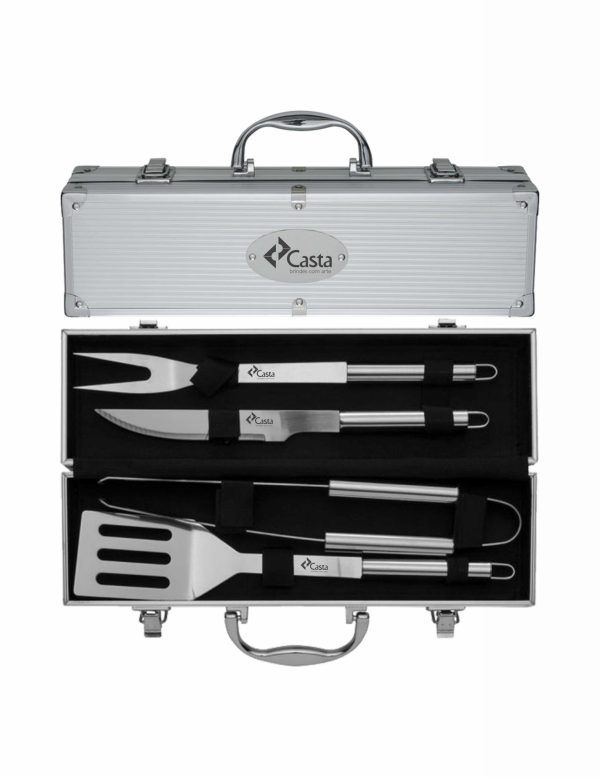 Kit churrasco 4 peças em maleta de alumínio com relevo. Possui: espátula, pegador, garfo e faca em inox(todas peças possuem proteção plástica) detalhes em metal nas bordas da maleta, duas dobradiças na parte inferior, uma alça e … Ver maisMedidas aproximadas para gravação (CxL): Plaqueta 4,7 cm x 6,6 cm – Espátula 10,2 cm x 1,3 cm – Pegador 10,2 cm x 1,3 cm – Garfo 10,2 cm x 1,3 cm – Faca 10,2 cm x 1,3 cmTamanho total aproximado (CxL): Maleta 13,1 cm x 38 cm x 6,9 cm – Espátula 34 cm x 7 cm – Pegador 34,3 cm x 6 cm – Garfo 33,7 cm x 3,3 cm – Faca 32,4 cm x 2,6 cmPeso aproximado (g): 987