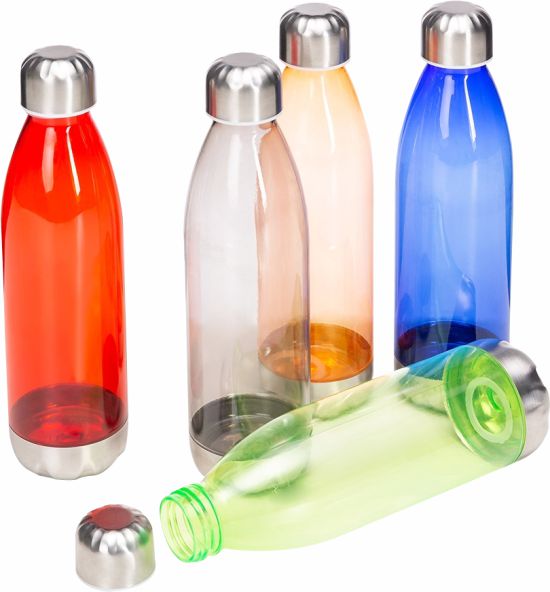 Descrição: Squeeze plástico 700ml formato garrafa. Corpo transparente colorido, possui tampa e base em alumínio.